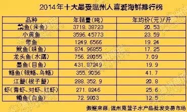 以2014年市场内水产品全年成交量1.1587万吨来计算,温州人每天要吃掉约6.3万斤海鲜。数据显示,在过去的一年中,温州市民吃得最多的十大海产品依次为 鮸鱼(米鱼)、小黄鱼、带鱼、鱿鱼(味鱼)、龙头鱼(水潺)、墨鱼(目鱼)、鲳鱼(银鲳、乌鲳)、江蟹(梭子蟹)、虾(青虾、对虾、红虾)、鳓鱼(白鱼)。值得一提的是,和2013年相比,市民吃得最多的十大海产品的品种并没有发生变化。高居榜首的 鱼去年卖出了约3718吨,年平均价每斤20.53元,相当于去年温州人吃掉了1.5亿元的 鱼。